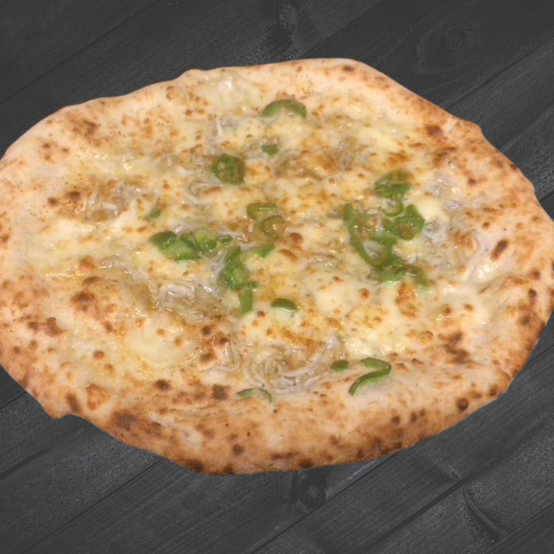 国産シラスをのせ、カラスミパウダーをまぶして焼き上げました。シラスとカラスミのコクが調和したピザになります。こちらの画像のピザには万願寺唐辛子をアクセントに入れております。万願寺唐辛子は時期が終了次第(12月中旬ぐらい)お入れできませんことをご了承くださいませ。