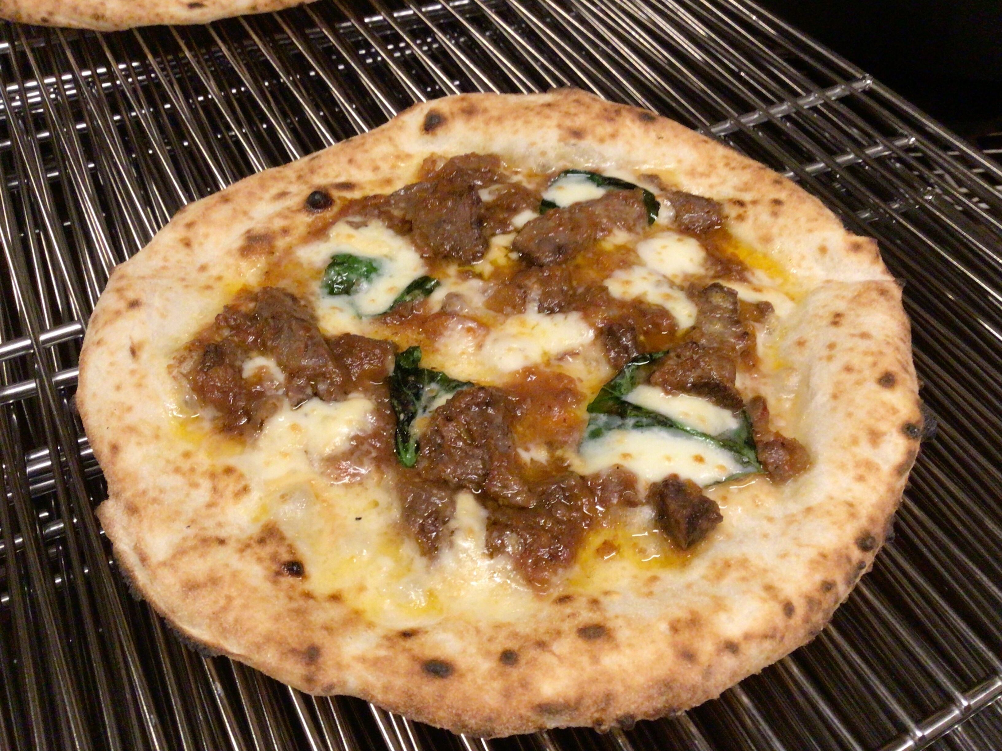 化学調味料は一切使わず、赤ワインでじっくり煮込んだ十勝ワインビーフのスネ肉の煮込みを贅沢にピザにしました。